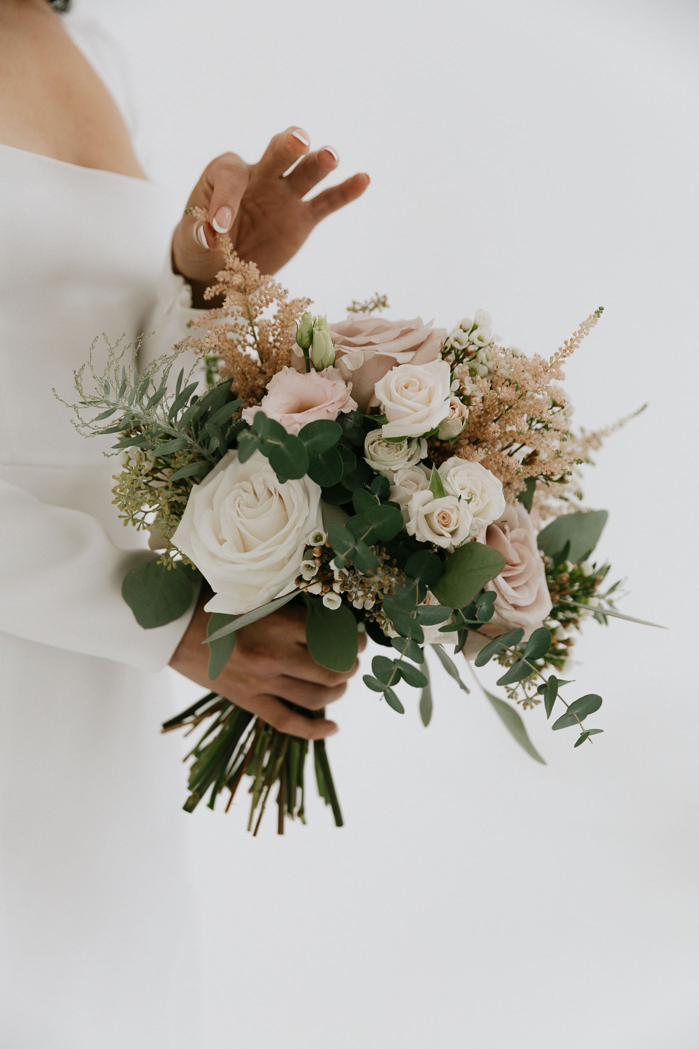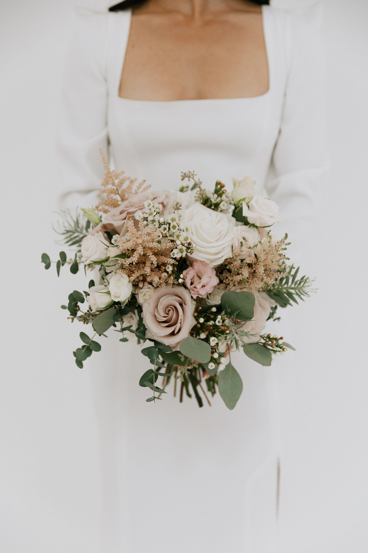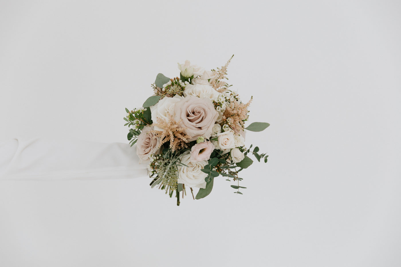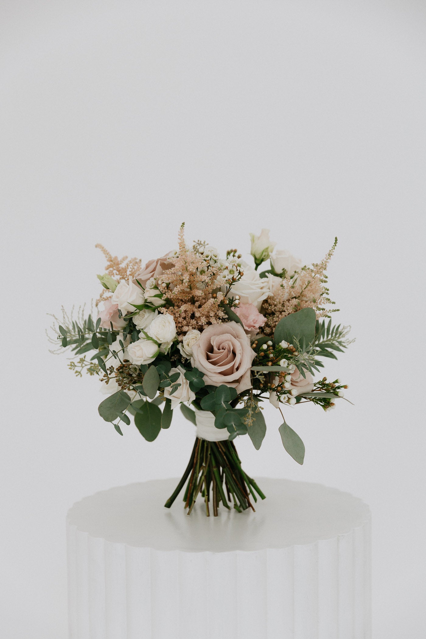 We choose the best flowers in season to match this palette’s tone and texture. You might find classic favourites, like roses or lisianthus paired with soft, airy stems and plenty of lush foliage.