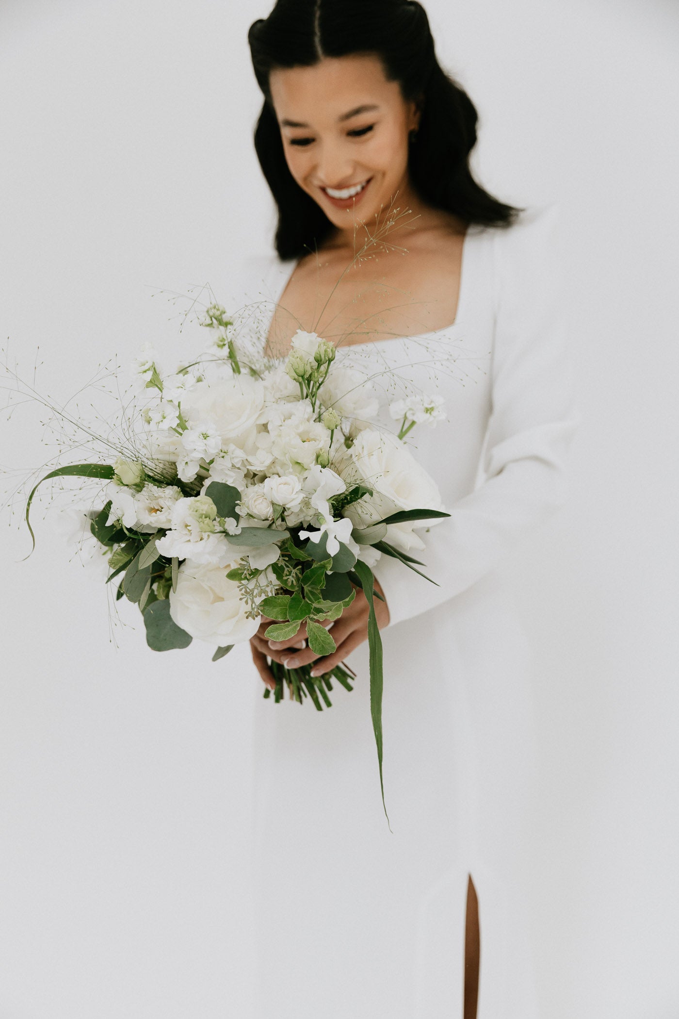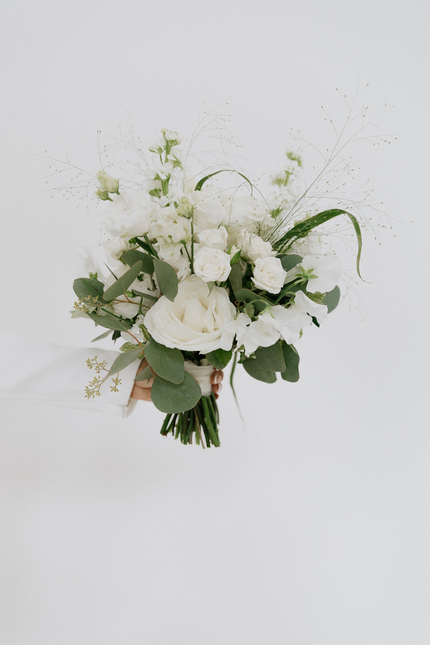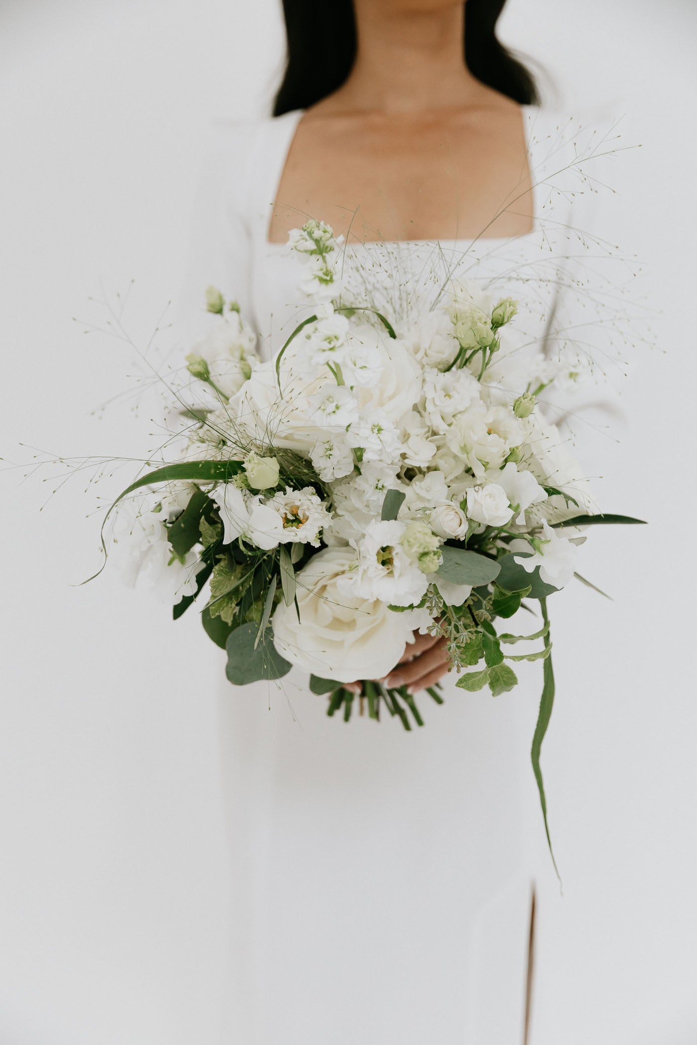 A timeless wedding bouquet in a fresh blend of white and green tones, hand-tied in our signature natural style.