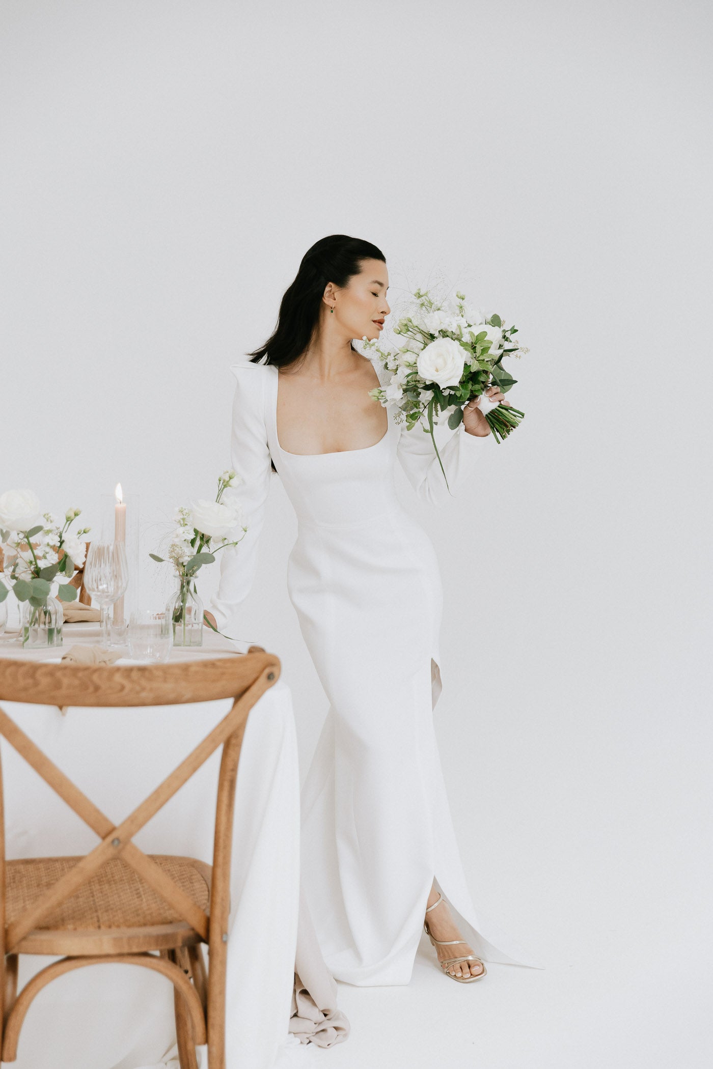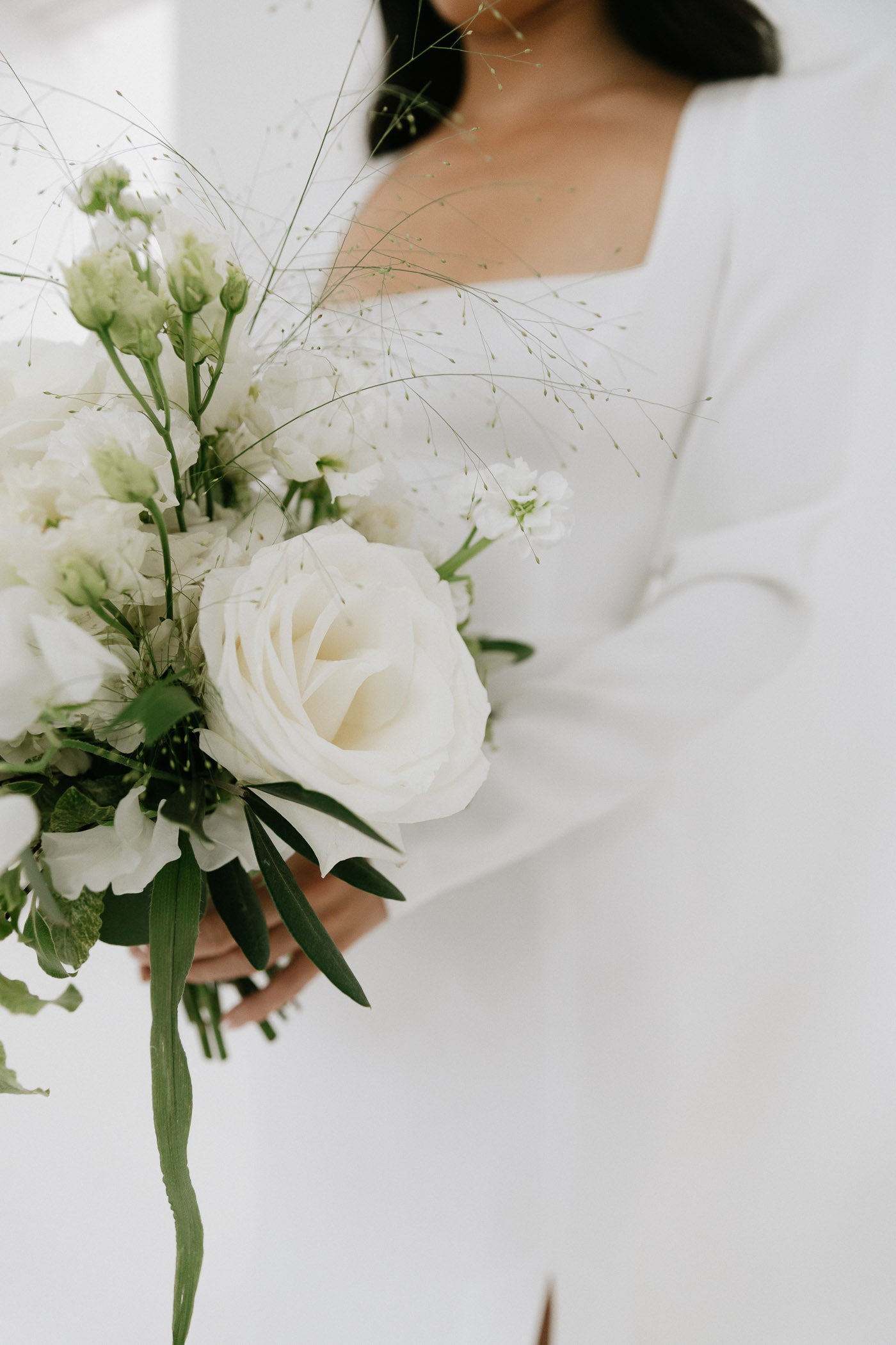 This bouquet is full of texture and quiet luxury – perfect for couples who love clean lines and classic details.