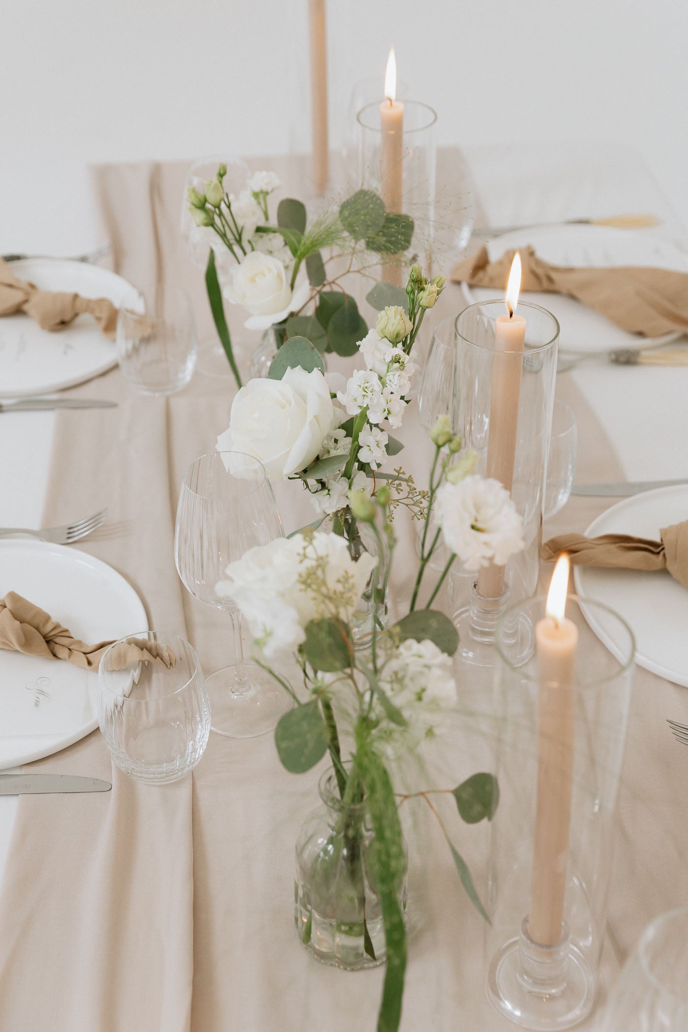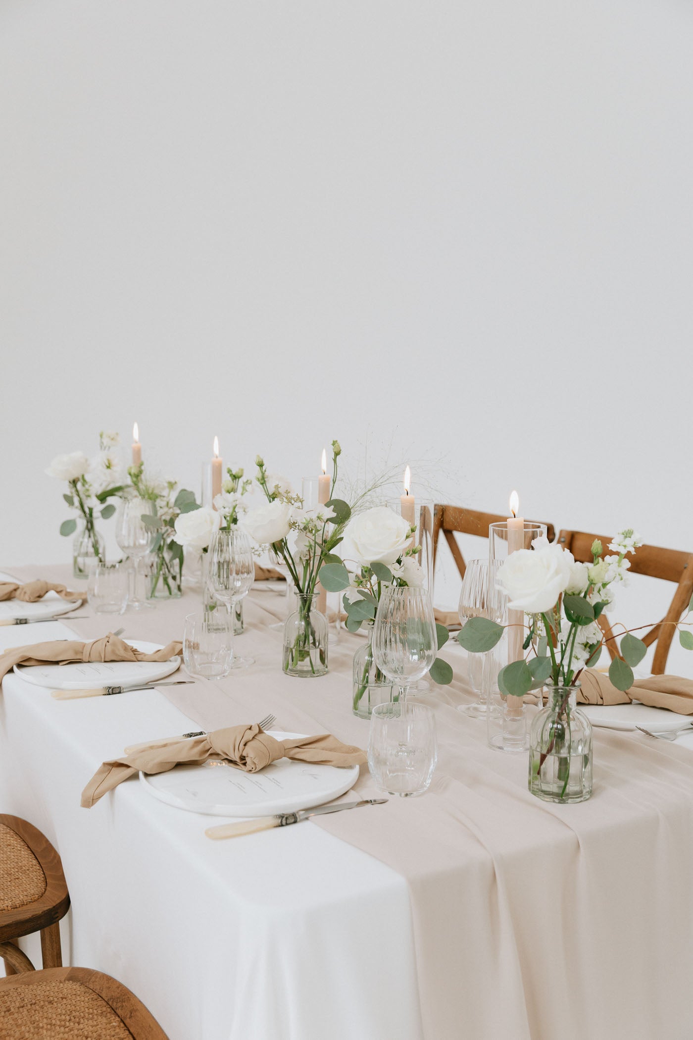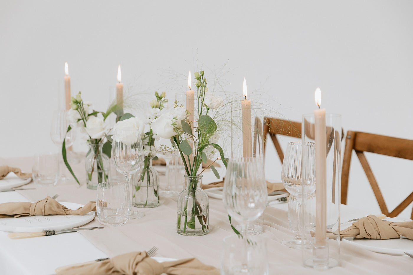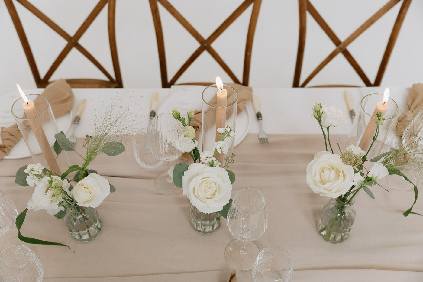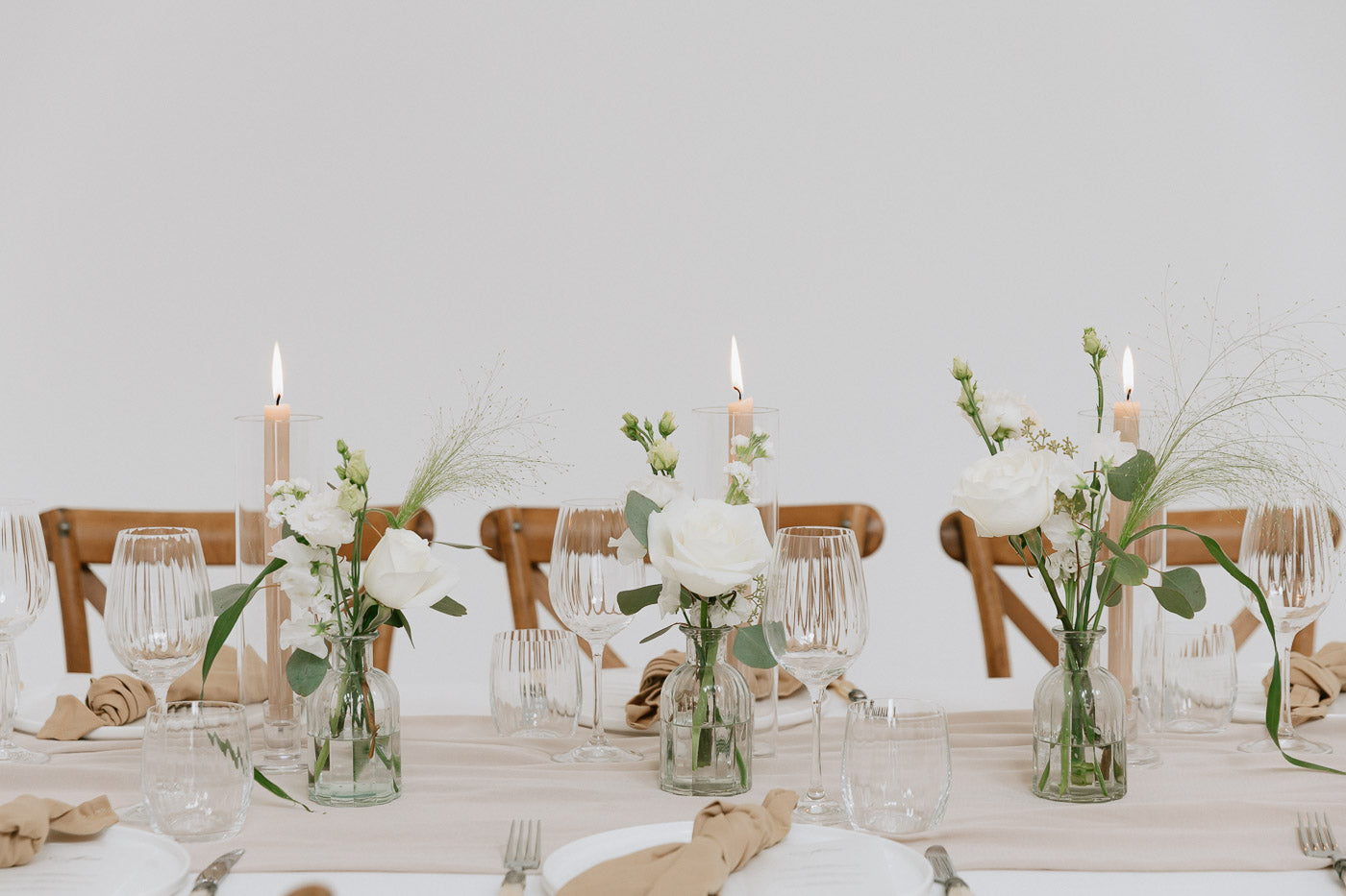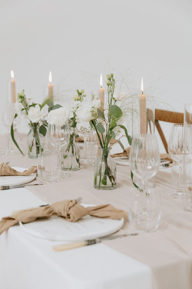 A trio of mini floral arrangements in fresh white and green tones – perfect for scattering down tables or styling small spaces. Each bud vase features premium seasonal stems and are yours to keep after the big day. A classic addition to your wedding decor.