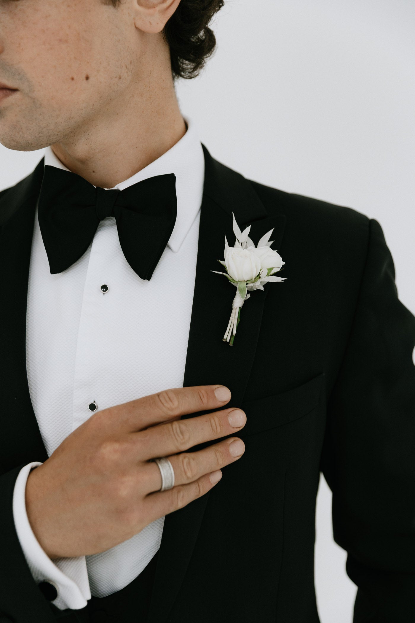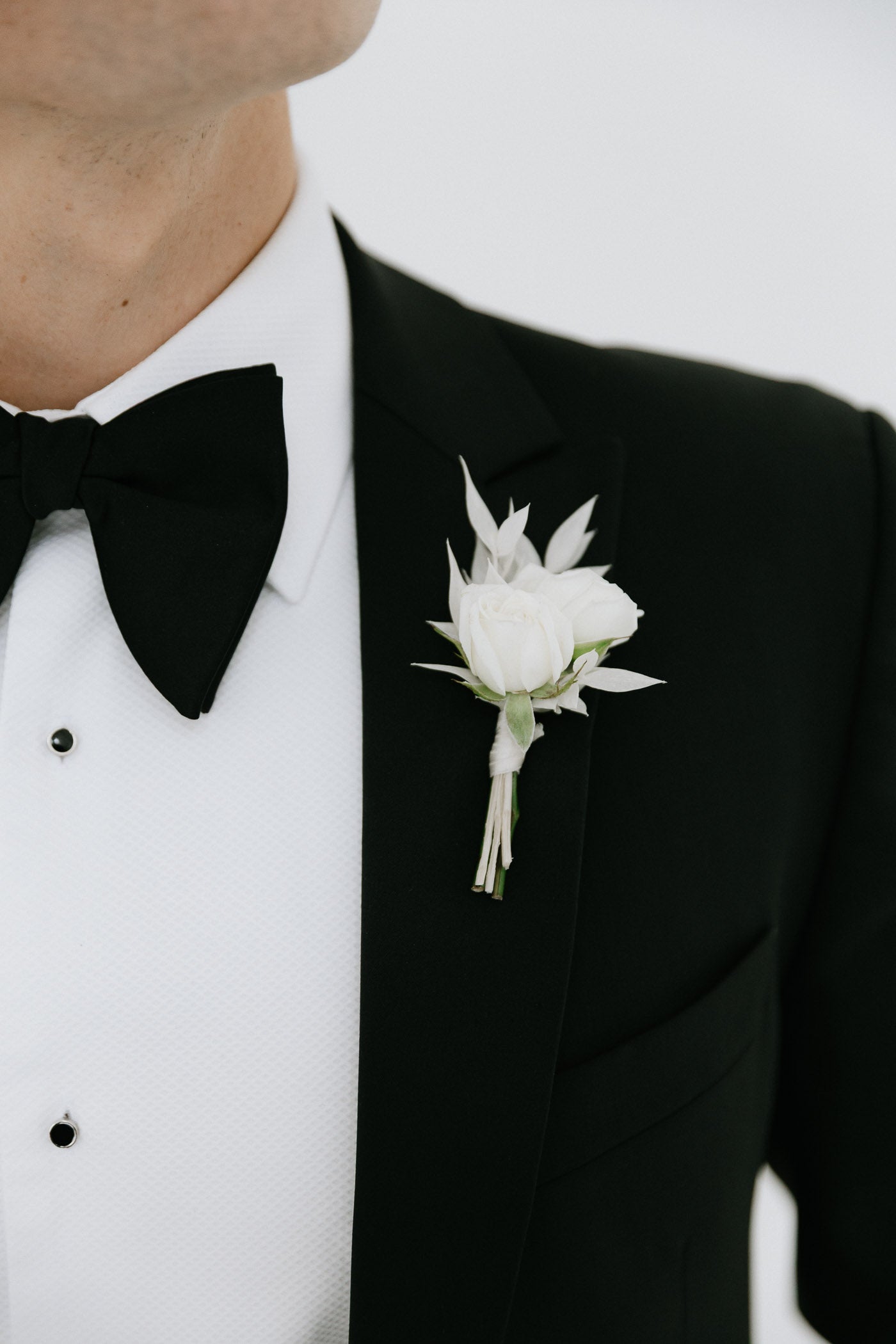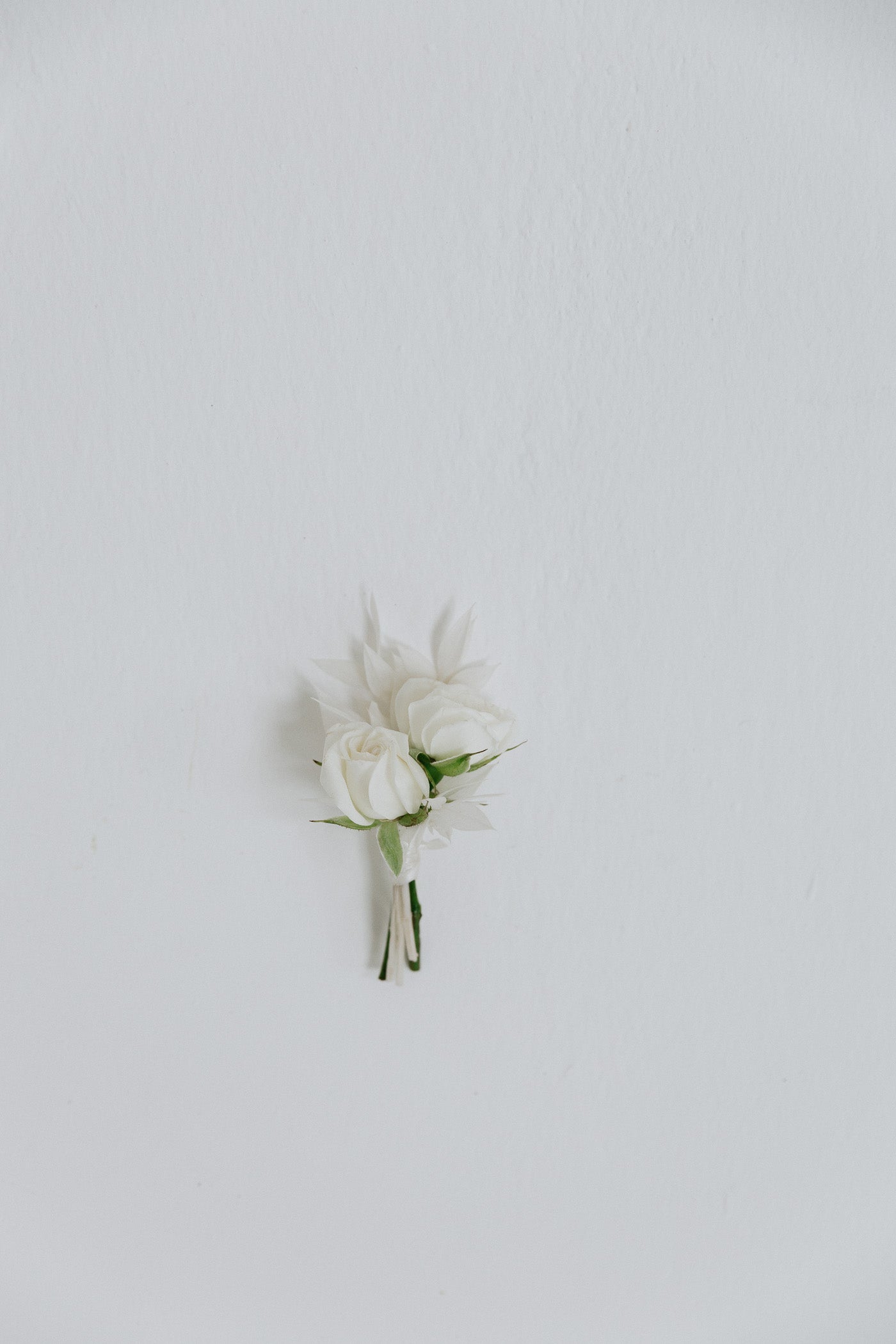 This elegant buttonhole features ivory rose blooms, styled with subtle accent foliage and wrapped in natural white ribbon for a polished finish. Understated yet impactful, it’s ideal for the contemporary groom who appreciates refined simplicity.