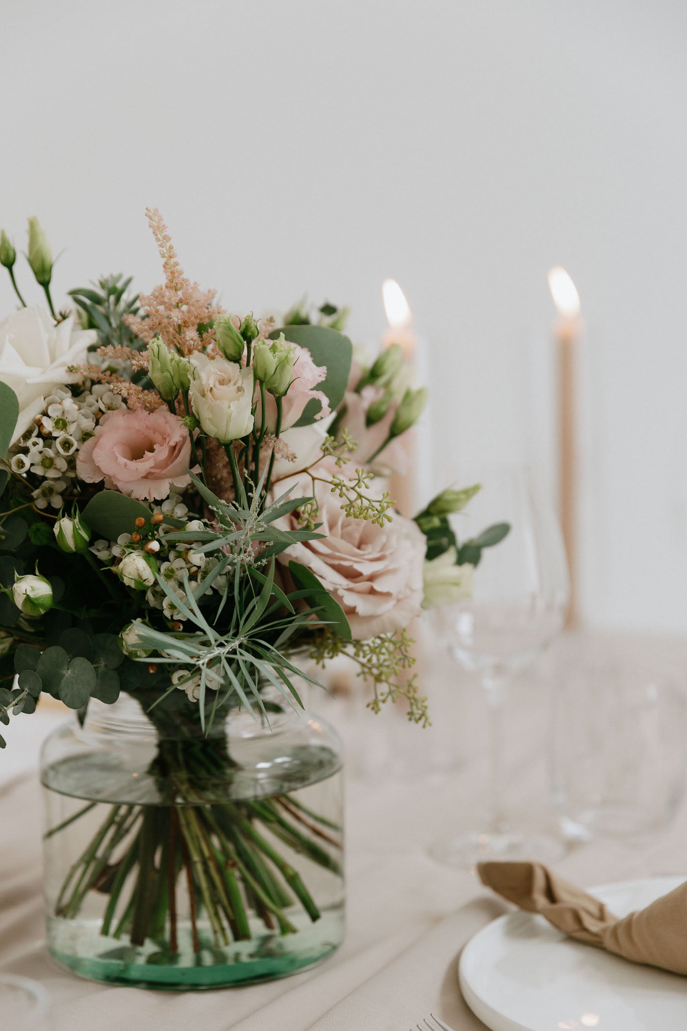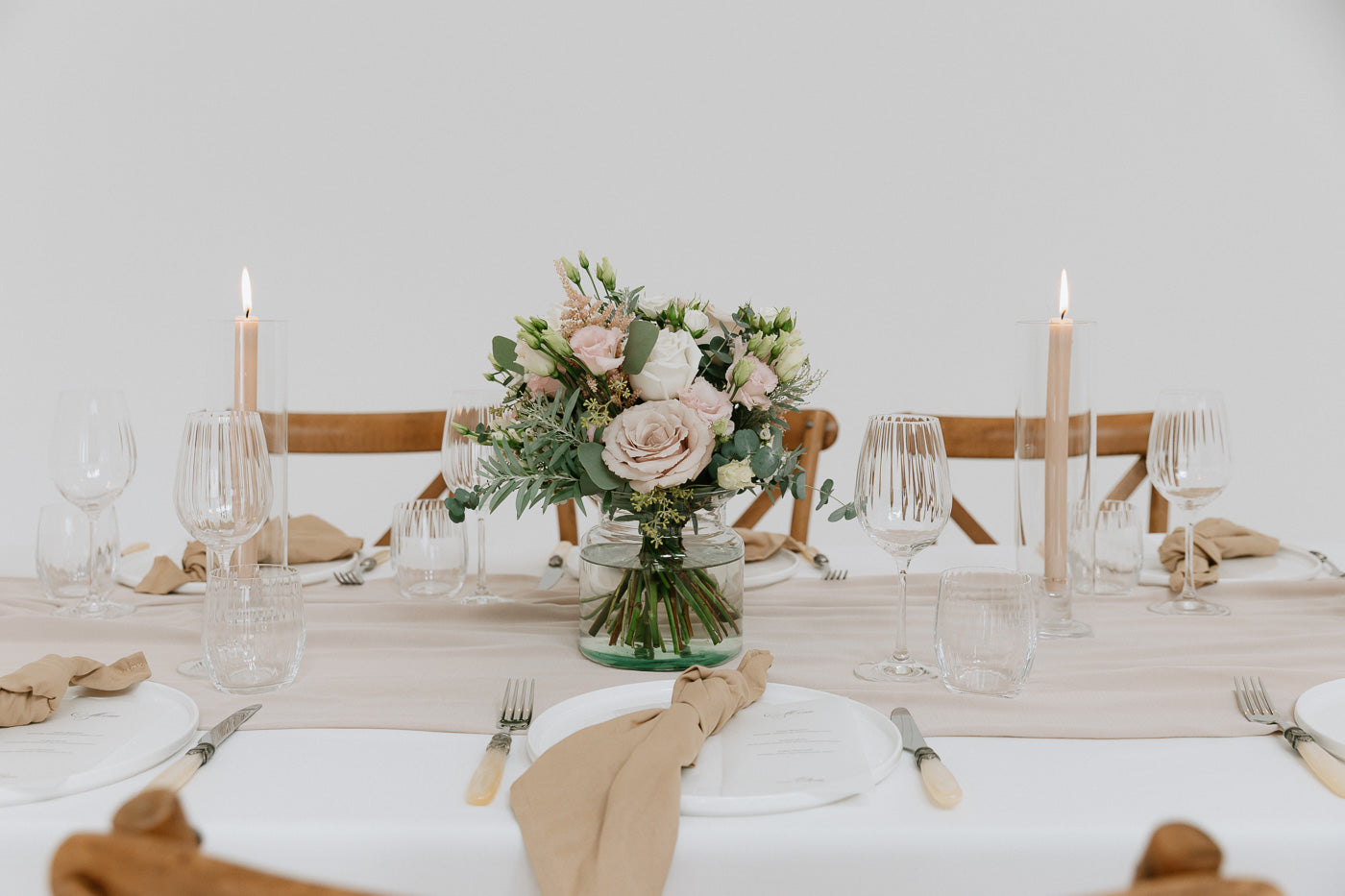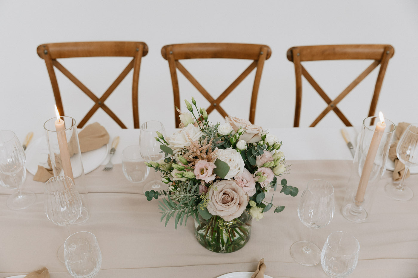 Expect a curated mix of quality, large-headed white and warm-toned blooms alongside pale pink flowers for softness and flow. To add movement and texture, we often include airy, trail-like flowers like clematis, alongside structured, powdery-toned stems like stocks or delphiniums. While specific flower types may vary with the season, your table centre will always reflect the Pretty Pastels palette.
