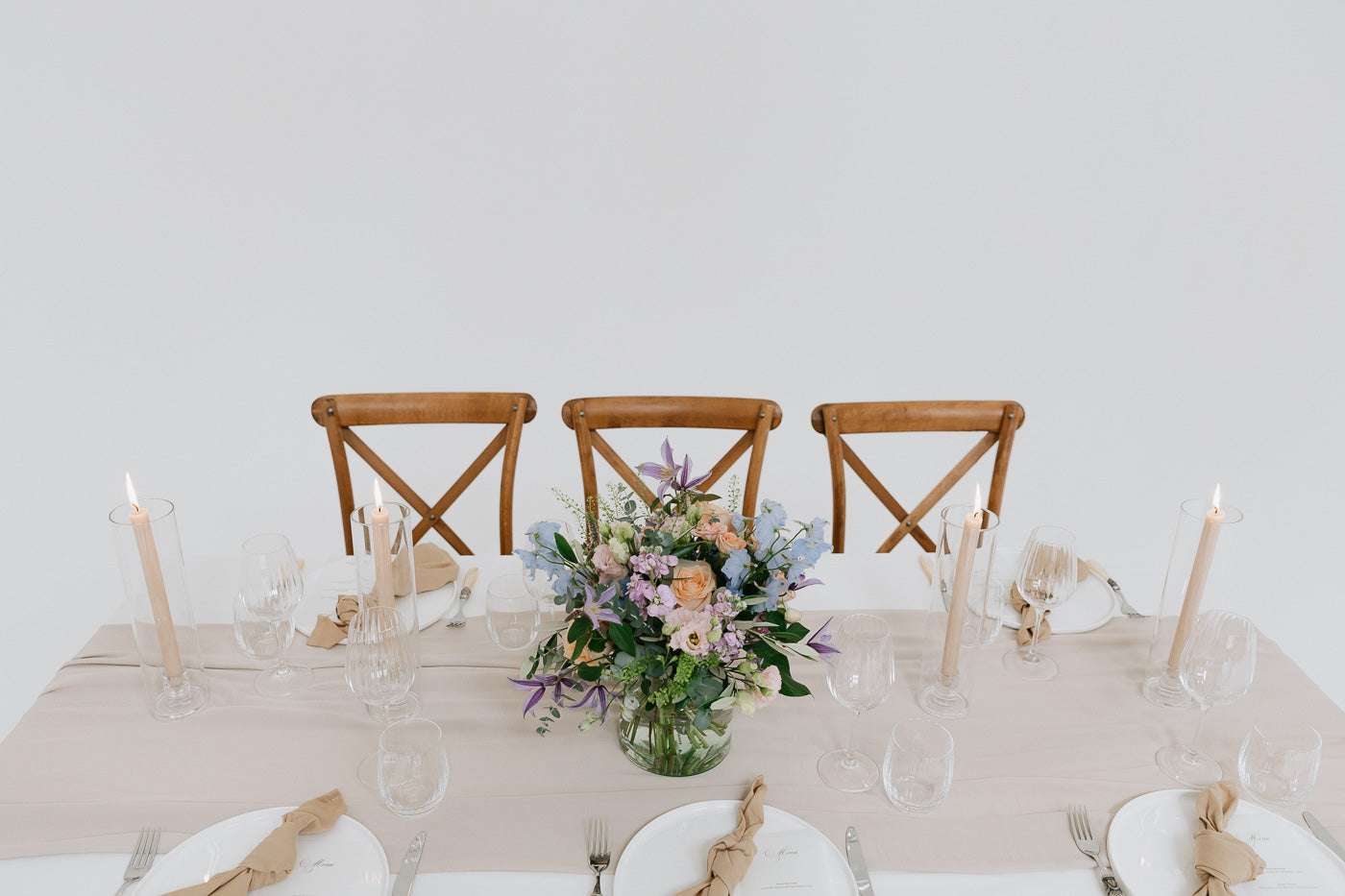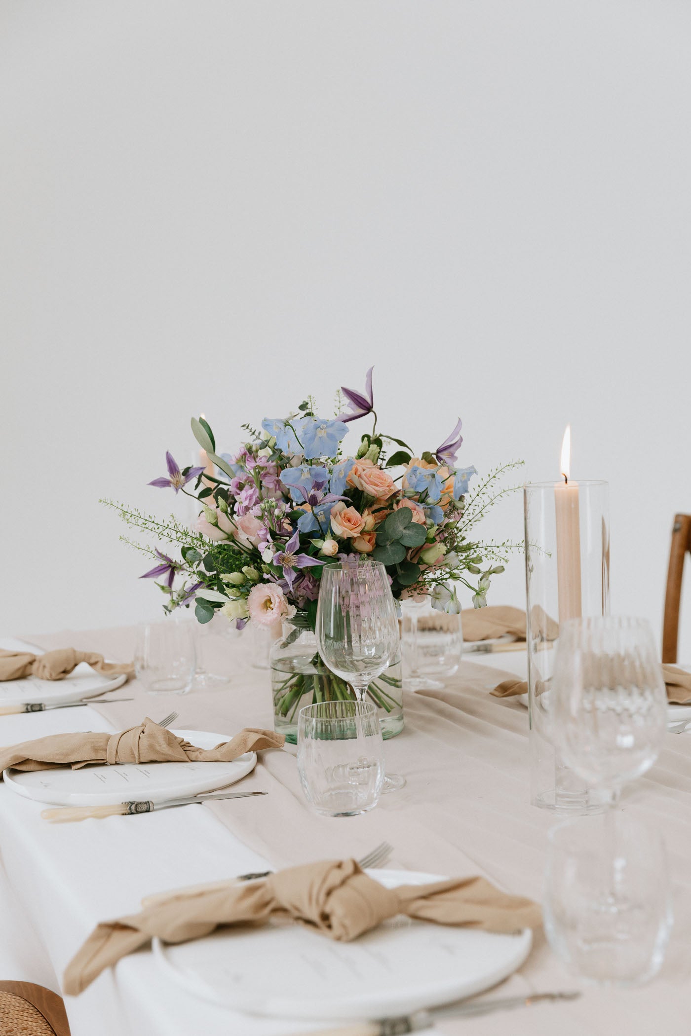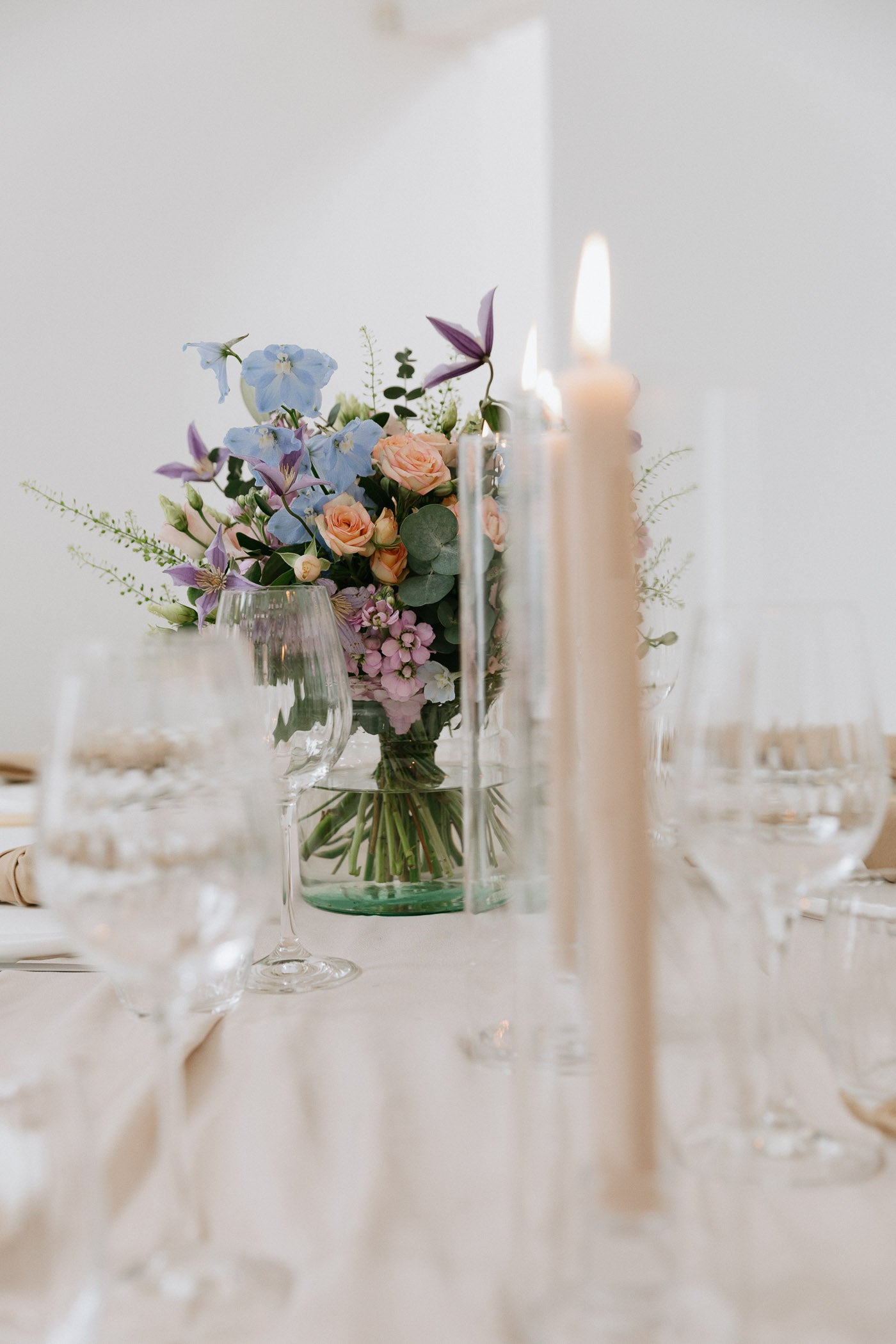A joyful mix of pastel blooms – think lilacs, blush and peach tones – arranged in a natural, garden-style vase display. Designed to suit any wedding table and includes the glass vase to keep.