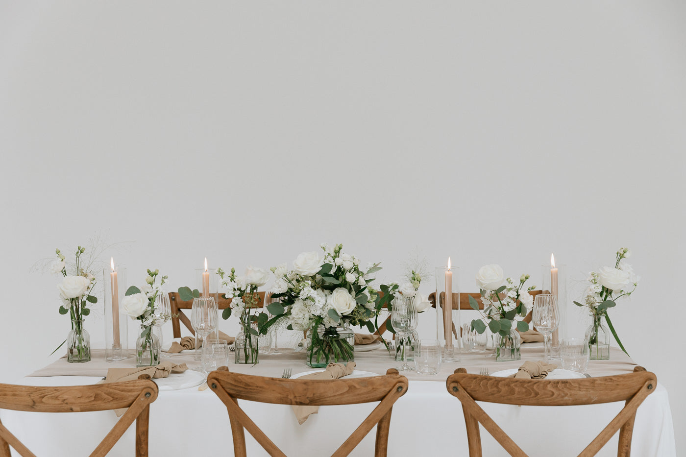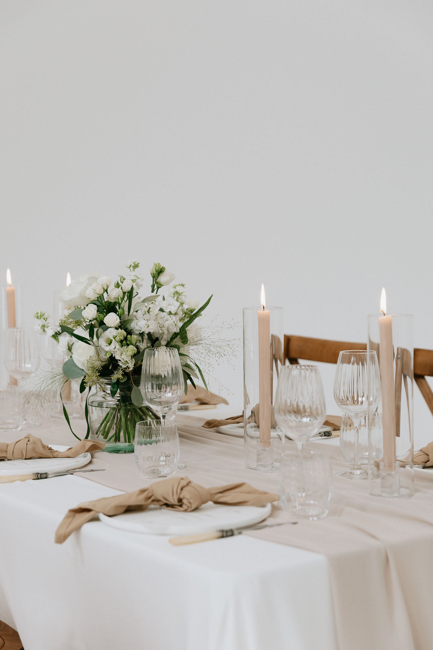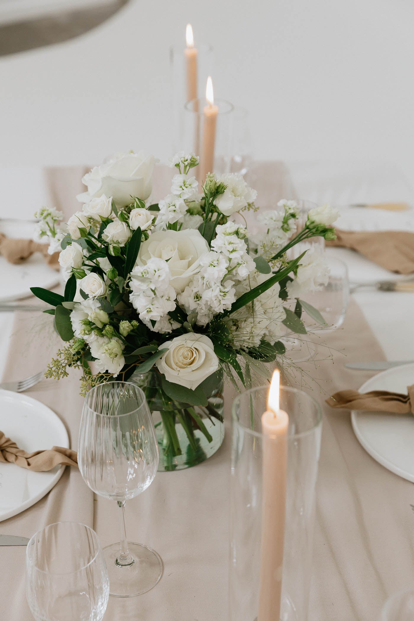 A fresh, full, table centre arrangement in classic white and green tones – ideal for top tables, guest tables or ceremony styling. Featuring seasonal white blooms and fresh green foliage, designed in our natural signature style and presented in a glass vase that’s yours to keep.