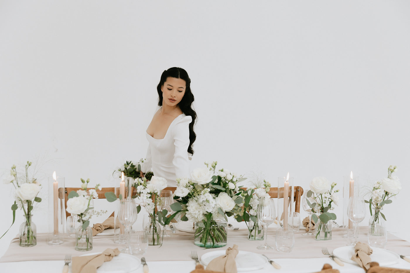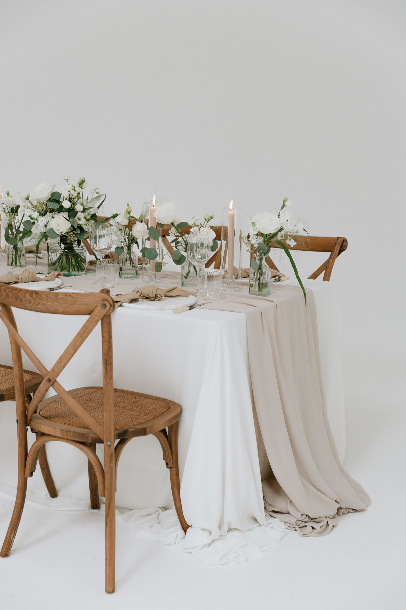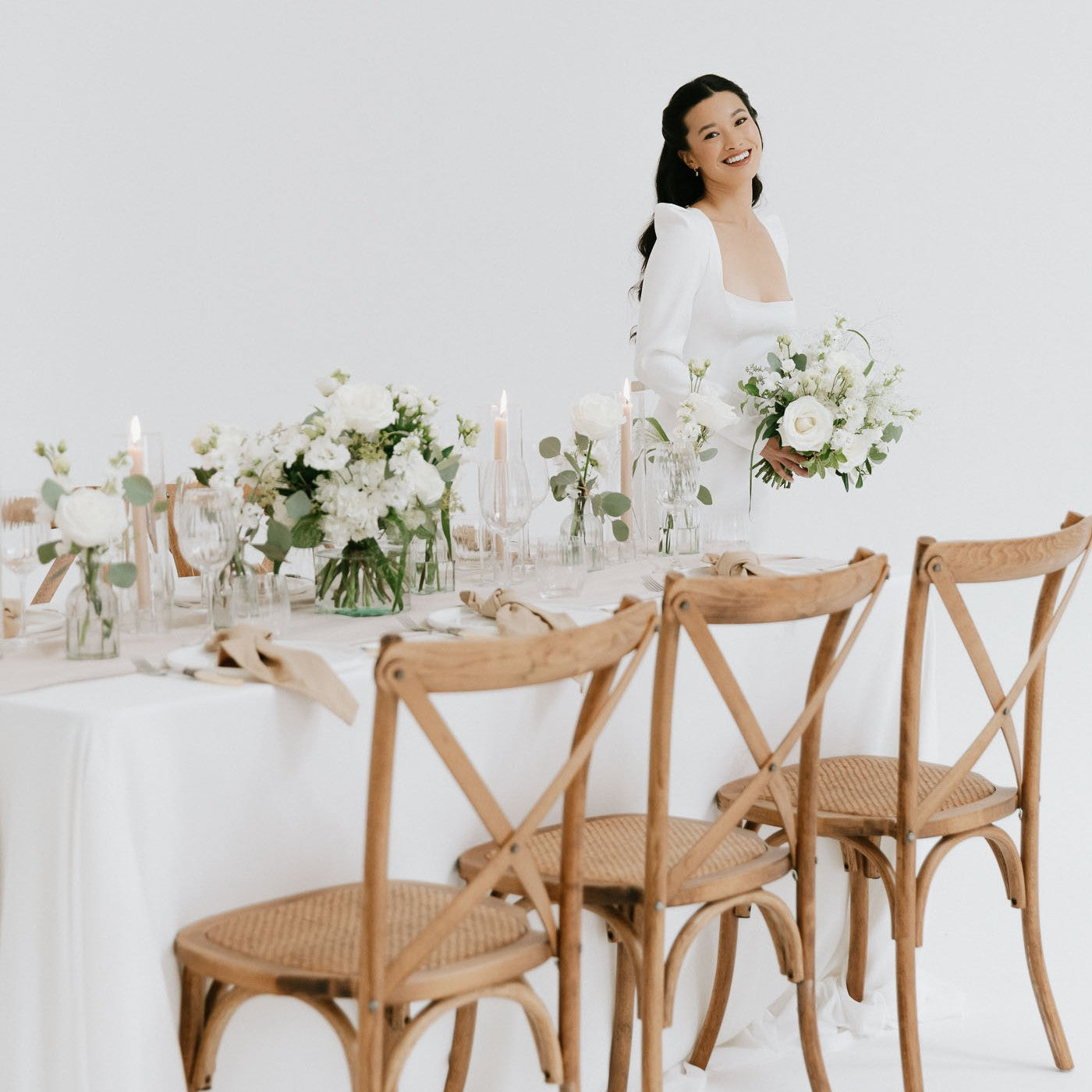 A fresh, full, table centre arrangement in classic white and green tones – ideal for top tables, guest tables or ceremony styling. Featuring seasonal white blooms and fresh green foliage, designed in our natural signature style and presented in a glass vase that’s yours to keep.